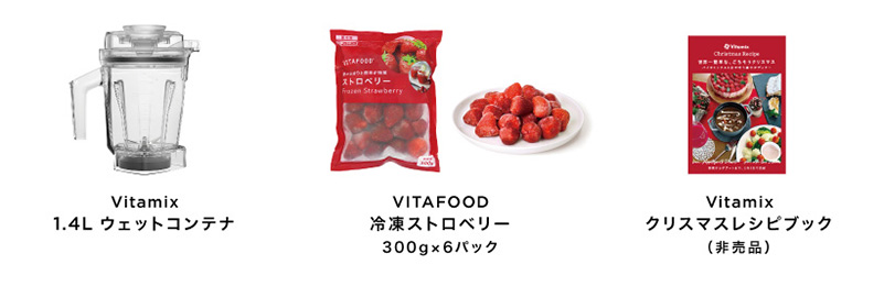 バイタミックス本体をご購入いただくと、「1.4Lウェットコンテナ」「VITAFOOD 冷凍ストロベリー」「クリスマスレシピブック(非売品)」が付いてくる!