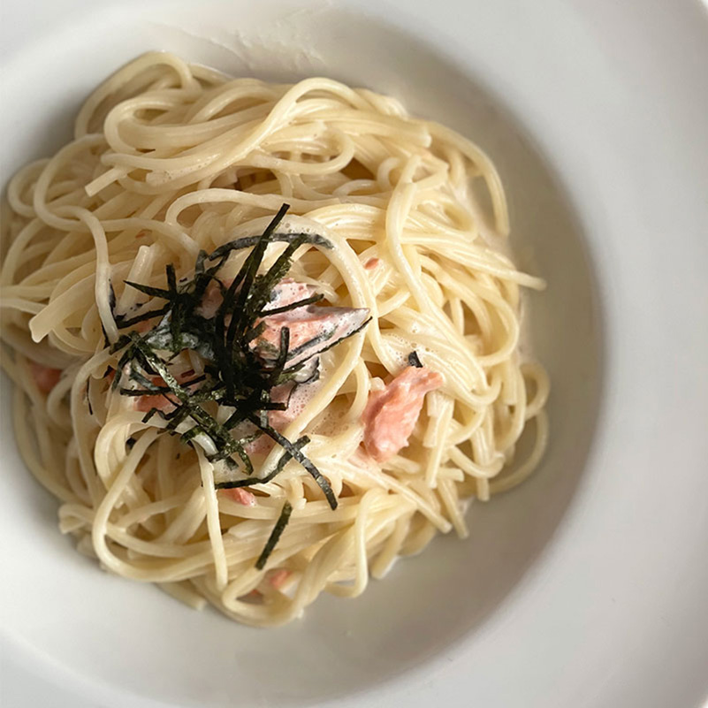 ソースに長ネギと鮭を入れて撹拌する事によって、風味のよい和風パスタソースとなります。