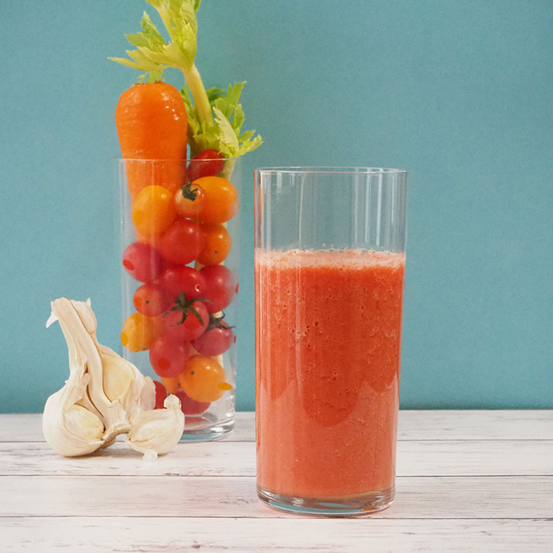 セロリや人参の香味野菜に、火を通したにんにくが深みをプラス。トマトのリコピンは、攪拌で細胞膜が壊れることで吸収されやすくなるため、美容やエイジングケアを意識する方にもおすすめです。氷を加えることで冷たく、なめらかなのど越しになります。