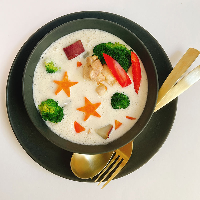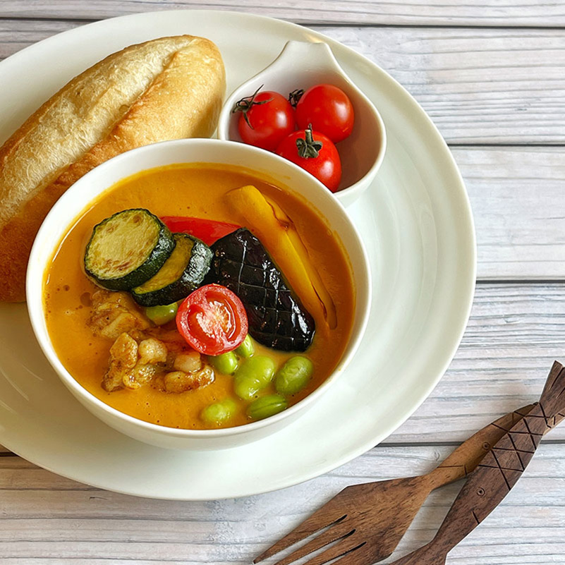 チキンを入れた野菜ゴロゴロのホワイトスープ。お好きな蒸し野菜をトッピングすることによってメインディッシュになるボリュームです。具材をしっかり食べるスープです。