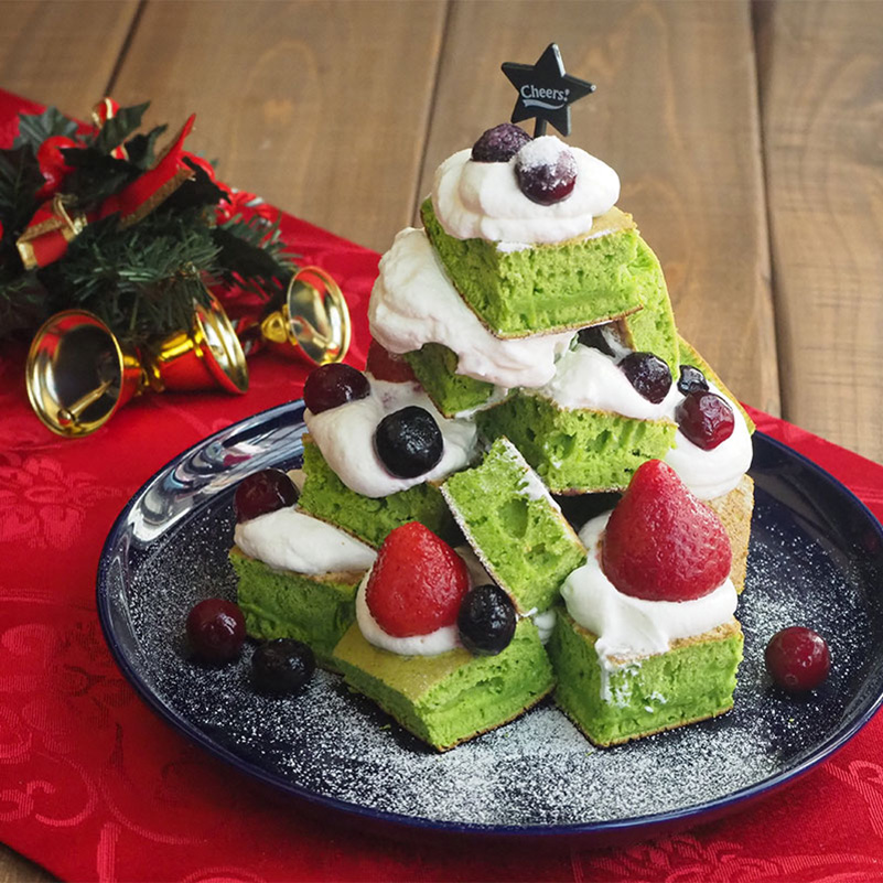 緑のほうれん草生地に真っ赤ないちごを飾れば、まるでツリーのような華やかなホットケーキ。野菜嫌いなお子さまでも楽しく食べられる彩りで、パーティーのテーブルが一気に明るくなります。