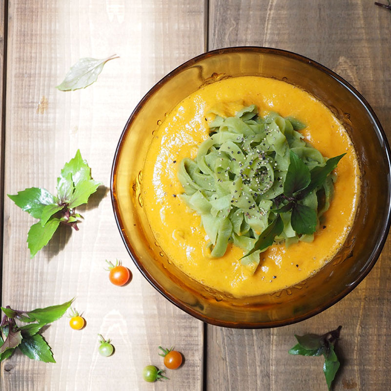 βカロテンとリコピンのダブル抗酸化。かぼちゃの自然な甘みとトマトの酸味がバランスよく、冷えた身体を芯から温めます。豆乳を加えることでまろやかさと満足感もアップ。