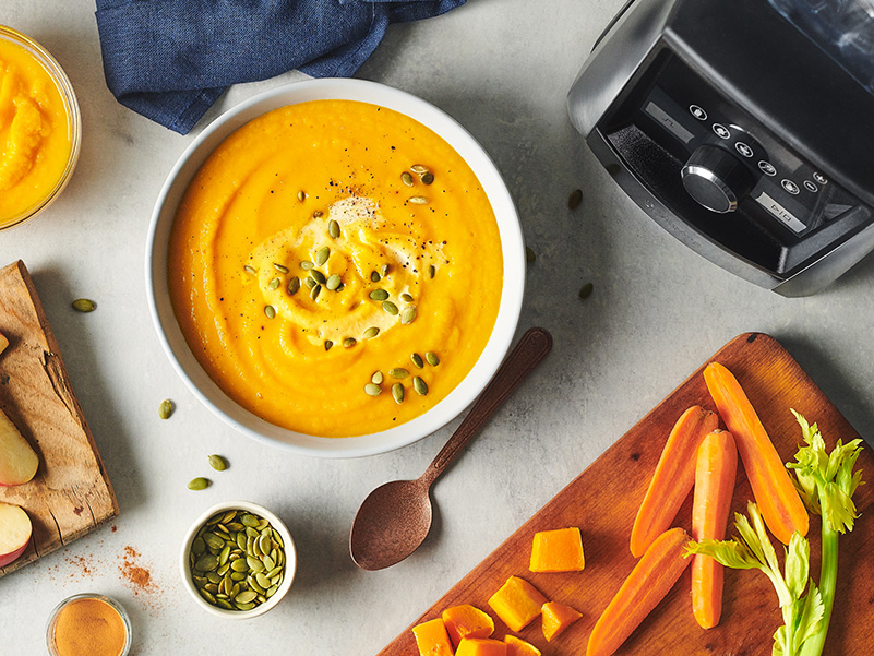バイタミックスのスープモードなら約5〜6分の攪拌熱で温かいポタージュに仕上がり、事前加熱は不要。仕事で疲れて帰った夜、キッチンに立つ時間を最小限にしながら、体にやさしい1皿が完成します。